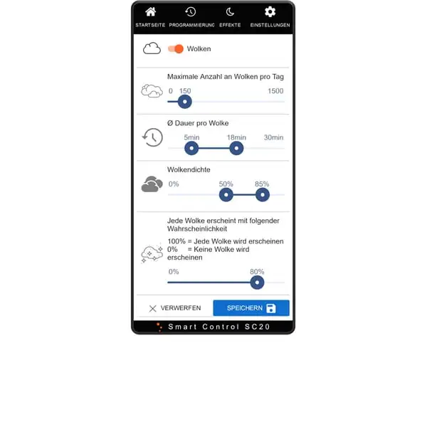 Zufällige Wolken-Simulation kann für jede Tages- bzw. Nachtzeit individuell eingestellt werden.
