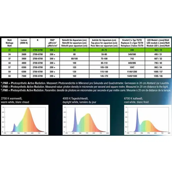 Délka lampy: 22 W / 38,3 cm; 24 W / 49,5 cm; 37 W / 68,7 cm; 44 W / 79,5 cm; 57 W / 99,2 cm; 59 W / 109,5 cm; 68 W / 139,5 cm