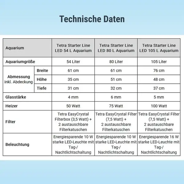 Die Tetra Starter Line Aquarien sind ideal für alle Aquaristik-Einsteiger geeignet. Die Aquarien sind nicht nur in vier verschiedenen Größen erhältlich (30, 54, 80 und 105 Liter), sondern auch mit hilfreichen Funktionen und wesentlichem technischen Zubehör ausgestattet. So ist das kleinere Modell besonders gut für Krustentiere und Pflanzen geeignet. Guppys, Platys und Co. halten Sie dagegen ideal im Aquarium der mittleren Größe. Die besonders stabilen Aquarienbecken sind mit 6 Millimeter starken Scheiben aus einem speziellen Float-Glas ausgestattet und sorgen somit aus jedem Blickwinkel für eine unverzerrte Sicht auf Ihre Aquarienbewohner. Auch die Aquarienabdeckung ist besonders robust, damit zum Beispiel kletterfreudige Krebstiere nicht entwischen können. Eine praktische Futterklappe im Deckel sorgt dafür, dass du deine Fische ganz einfach füttern kannst, ohne die Abdeckung abnehmen zu müssen. Die in der Abdeckung integrierte 16 Watt starke LED-Leuchte mit Tag-/ Nachtlichtschaltung lässt dein Aquarium in einem hellen und natürlichen Licht erstrahlen und ist dabei besonders energiesparend und langlebig. Zusätzlich sorgt der im Set enthaltene Tetra EasyCrystal Filter für sauberes und kristallklares Wasser, da er Algen und Verunreinigungen zuverlässig beseitigt. Und das funktioniert so: Bei der biologischen Filterung sorgen Bio-Filterbälle und ein Filterschwamm für die Ansiedlung nützlicher Bakterien. Bei der mechanischen Filterung dagegen entfernt ein Filter-Vlies kleinste Schwebeteilchen aus dem Wasser. Und das Beste: Durch austauschbare Filterkartuschen bleibt dir eine aufwendige Reinigung des Filtergehäuses erspart. Die Kartuschen sind kinderleicht und ohne nasse Hände einsetzbar. Für eine optimale Wasserqualität solltest du die Kartuschen alle vier Wochen auswechseln. Eine Ersatz-Filterkartusche ist im Set enthalten. Die Komplettsets des 54, 80 und 105 Liter Aquariums enthalten zudem einen zuverlässigen Heizer, der die Wassertemperatur konstant bei 25°C hält. Detaillierte Angaben zum Fischbesatz ist der Verpackung des jeweiligen Aquariums zu entnehmen. Die einfache Installation und das umfassende technische Zubehör machen das Tetra Starter Line Aquarium zum idealen Aquarium für jeden Aquaristik-Einsteiger.